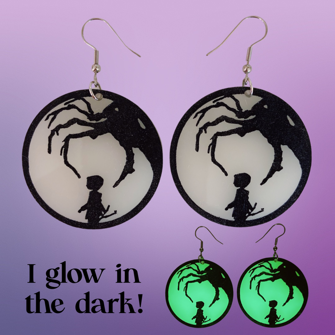 These earrings are made out of glow in the dark acrylic that has been engraved and hand painted with details. The hooks are made of stainless steel. All my designs are digitally created, laser cut and then hand assembled.