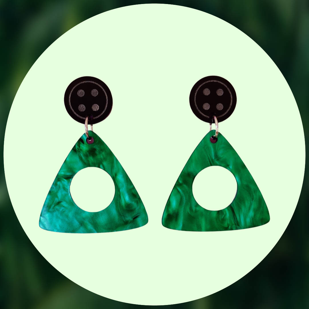 These earrings are made out of beautiful marbled green acrylic. The stud is made out of stainless steel with an engraved and hand painted button as the front. These are a medium sized earring. All my designs are digitally created, laser cut, and then hand assembled.
