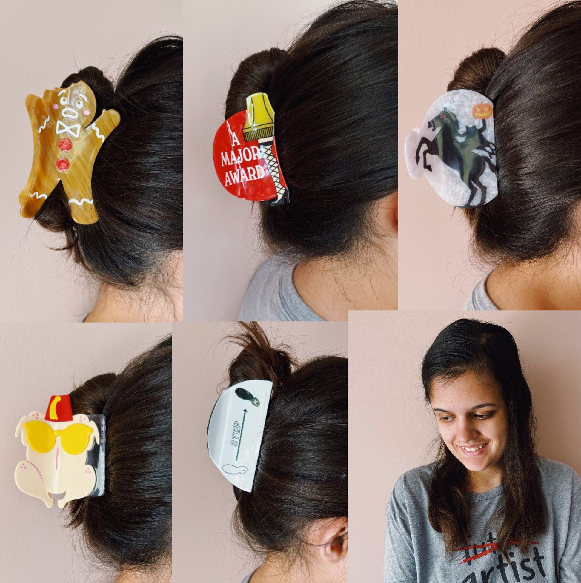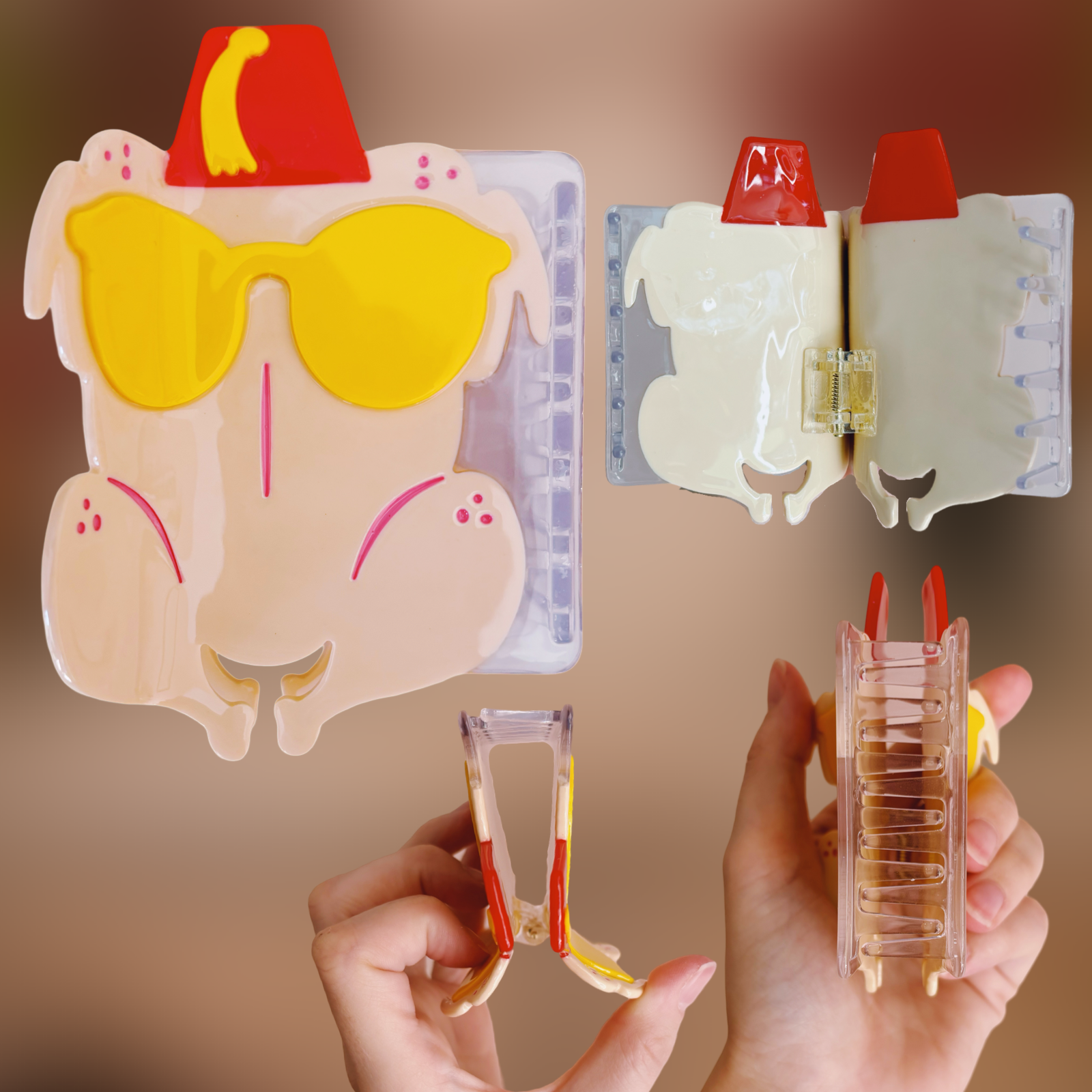 Turkey Hair claw is made out of high quality acetate with painted details. The clear edge is so that it holds comfortably in your hair and on your head. This claw is 4 inches in length and approximately 3 inches in width. All my designs are digitally created in my home studio but outsourced for manufacturing.